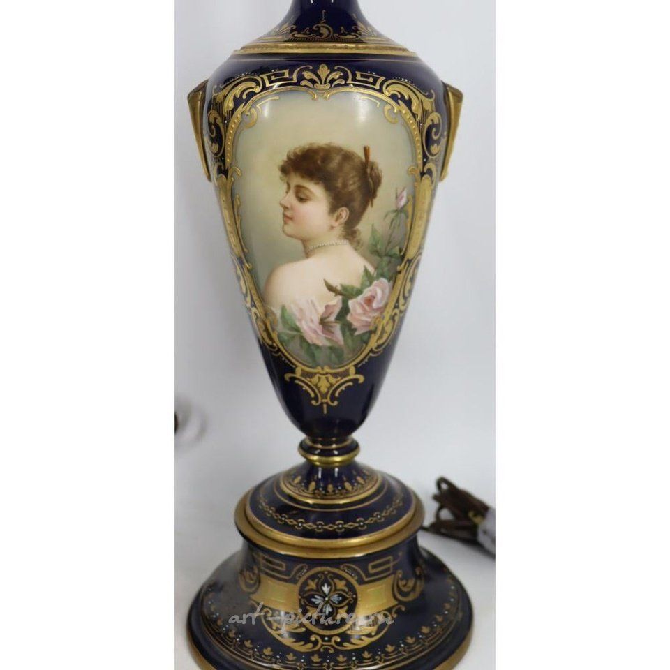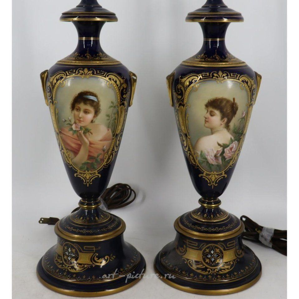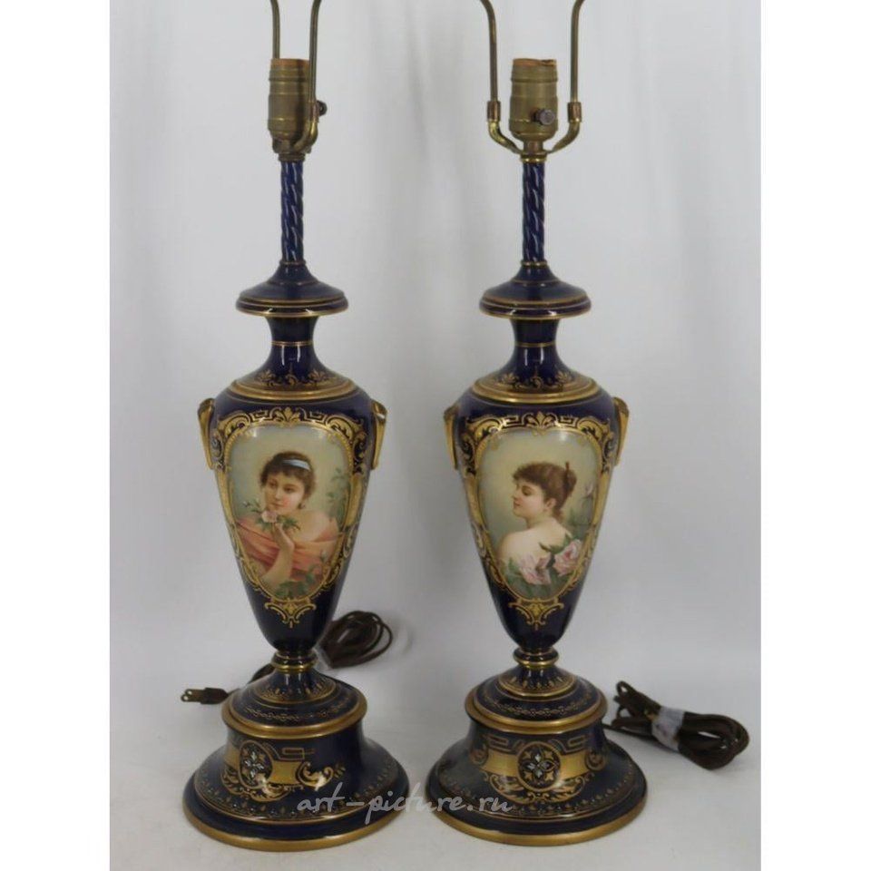 Подписано "C. Хер". Каждая лампа показывает портрет прекрасной женщины. Возможно восстановление или повреждение областей ручки. Принадлежит Хоторну, Нью-Йорк.