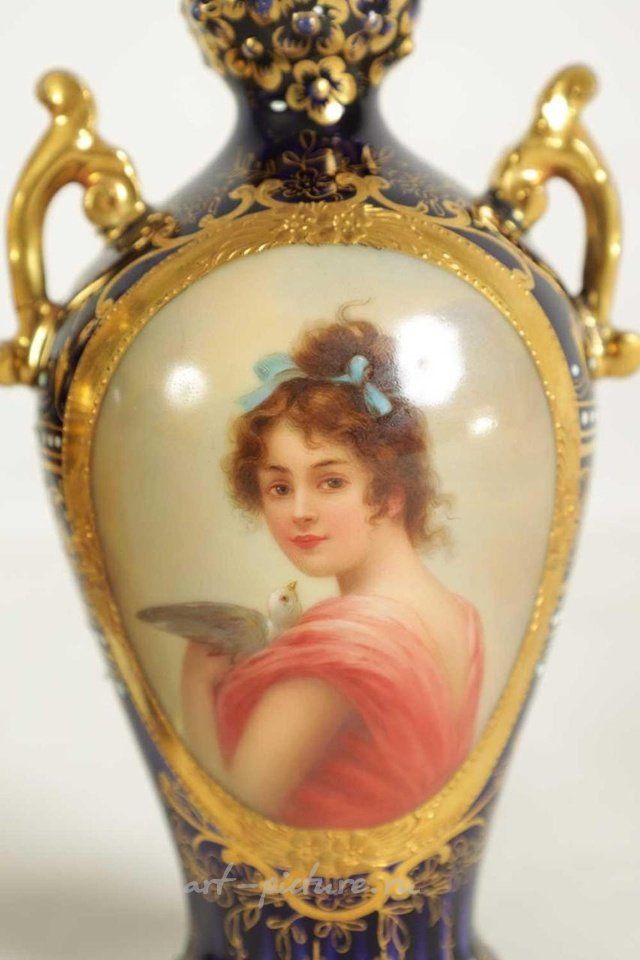 Предлагается пара позолоченных двуручных шкафных ваз в стиле Венского XIX века с царским синим фоном. Каждая ваза украшена портретами молодых женщин на позолоченном фоне с ювелирными растительными узорами. Высота каждой вазы составляет 13 см.
