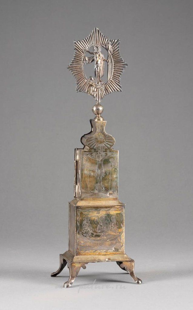 Москва, 1817 г. Верхняя часть заканчивается в форме оги и увенчана изображением Воскресения Христова. Маркирован городским клеймом, клеймом пробирщика, стандартом 84 и клеймом мастера "AL" кириллицей. Высота 37 см, вес 446 гр.