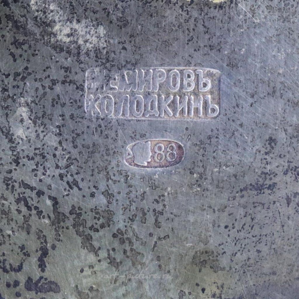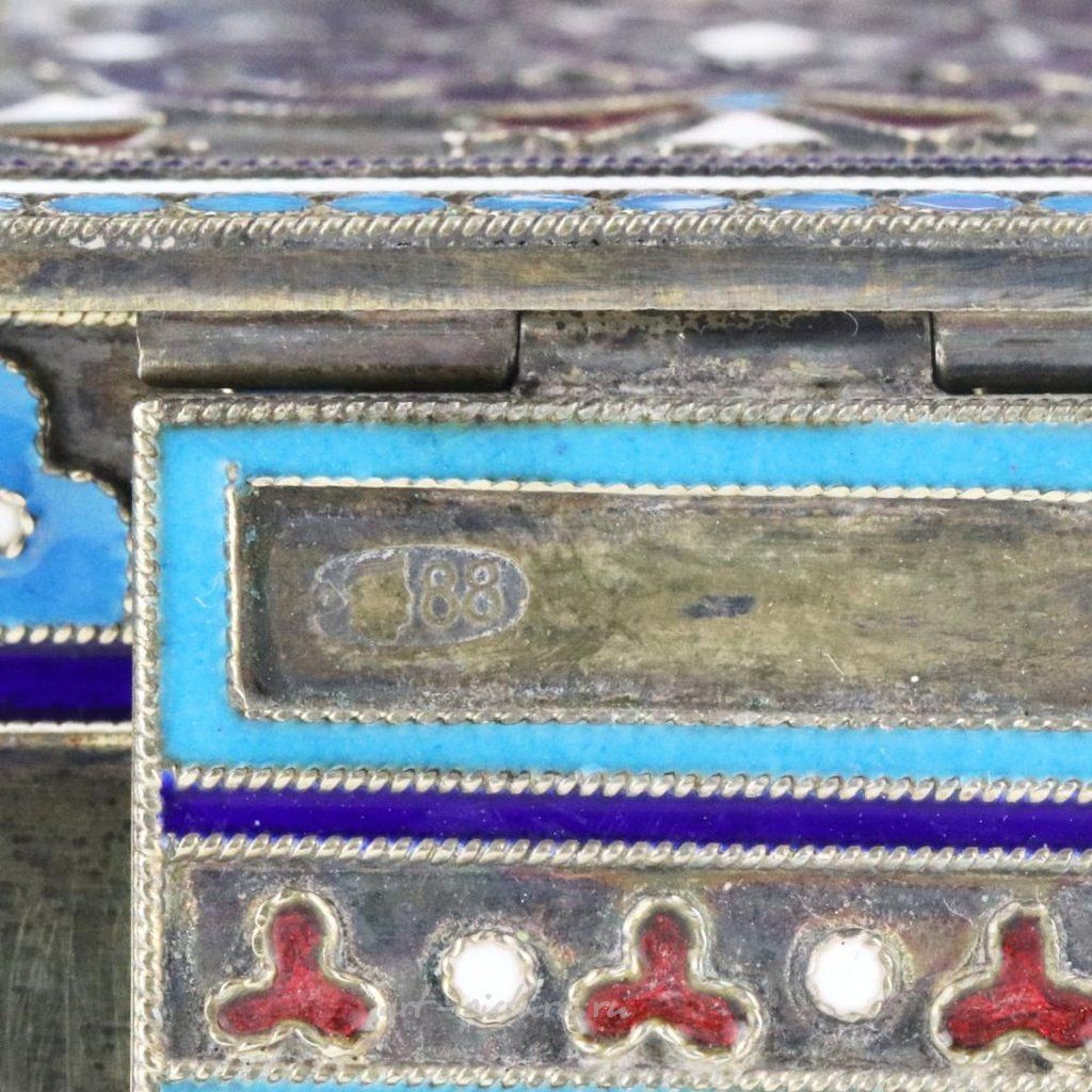 Серебряная солонка-трон с перегородчатой эмалью. Строгая геометрия неорусского стиля, украшена ярким и жизнеутверждающим орнаментом из голубой эмали, с рисунком, имитирующим полотенце. Весь объем солонки с оригинальным решением спинки опирается на сферические ножки. Полное клеймо Немирова-Колодкина и, возможно, московские клейма из серебра 88 пробы 1908-1917 годов - на основе предмета. Высота: 10