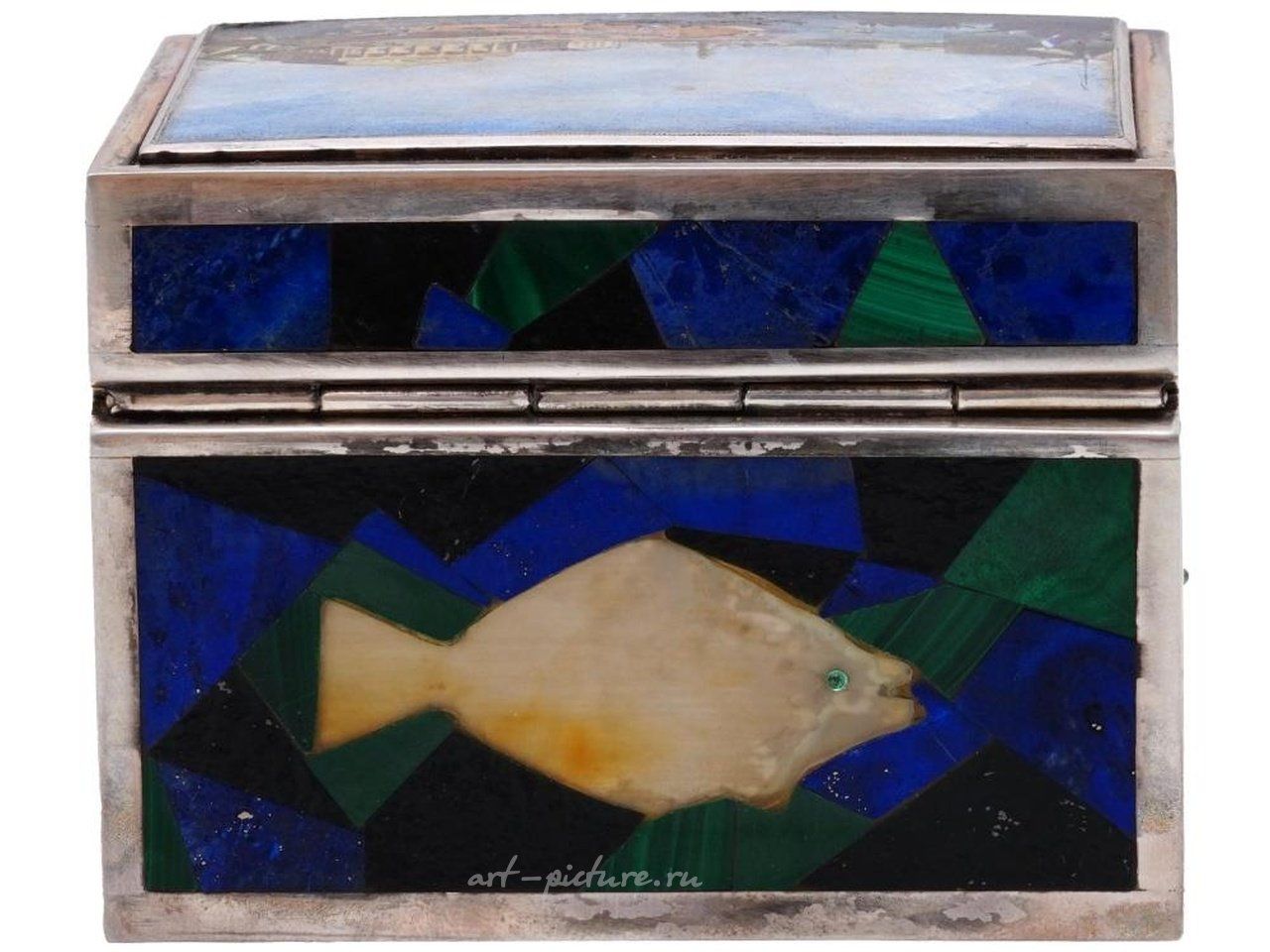 Императорская русская серебряная презентационная шкатулка с петлевой крышкой, украшенная эмалированной картиной Невы в Санкт-Петербурге, изображающей вид Старой Санкт-Петербургской Фондовой биржи и Ростральных колонн. Боковины украшены мозаичными камнями с изображениями рыб. Внутренняя часть имеет позолоченное покрытие. Шкатулка имеет клеймо производителя и клеймо 88 русского серебра. Поставляется в деревянной коробке. Общий вес: 425 г. Этот предмет является частью коллекции Декоративных шкатулок и...
