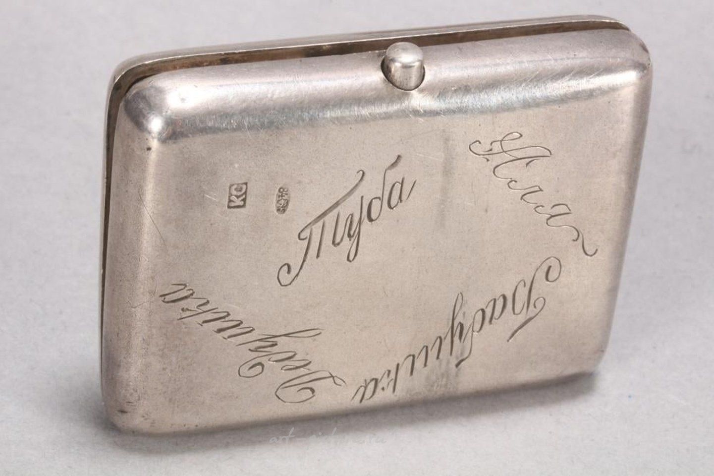 С маркировкой "Москва, К.К.", 1896-1908, прямоугольной формы, с выгравированными подписями на корпусе, с внутренней отделкой из шелка, общий вес 55 г, 6,5 см х 4,5 см Происхождение: Коллекция покойного Фредрика Синфилда, Сидней, Новый Южный Уэльс, 1938-2008