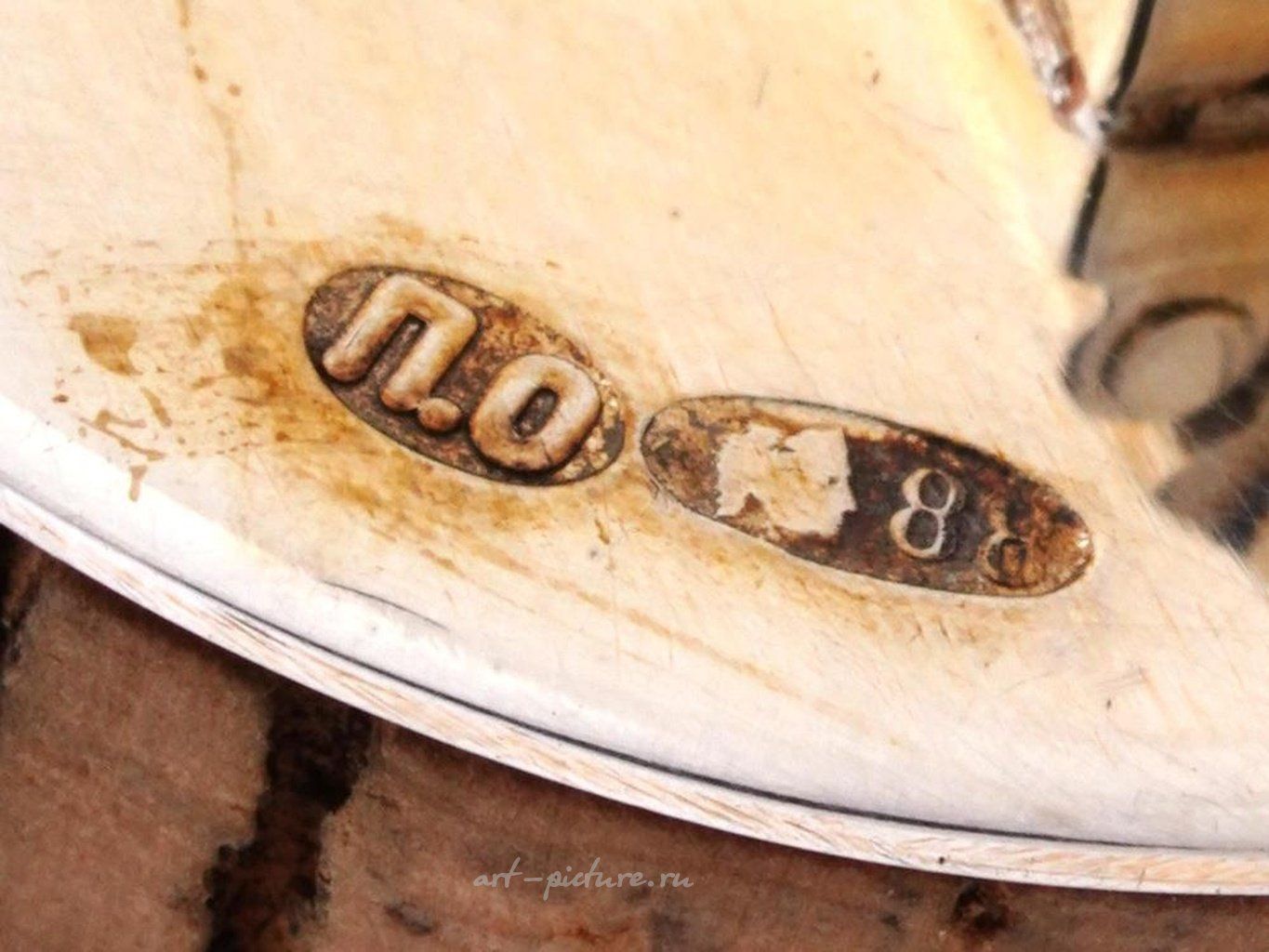 Посуда трапециевидной формы покрыта эмалью с полихромными цветочными, лиственными и спиральными узорами, выполненными в технике перегородчатой эмали. Крышка посуды украшена полихромным изображением цветка, окруженного растительными и лиственными мотивами, выполненными в той же технике. Дополнена позолоченной серебряной пробкой внутри. Отмечена стандартным российским серебряным клеймом 88 пробы, знаком производителя