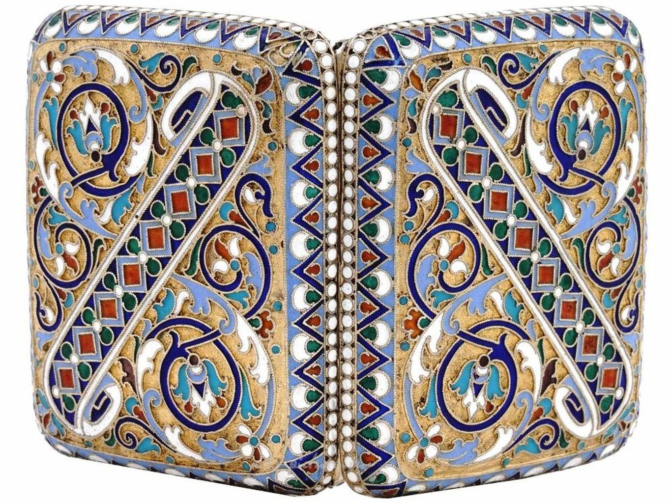 Портсигар из русского позолоченного серебра с откидной крышкой. Изделие украшено полихромной перегородчатой эмалью. На ободке - клеймо серебряной пробы 84 пробы и марка производителя. Общий вес: 118 грамм. Коллекционное Русское Столовое Серебро и Ювелирные Изделия, Табачные Аксессуары.