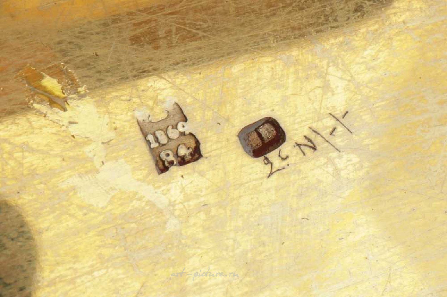 Русская табакерка Александра II середины 19 века "золотник", новинка, серебро и эмаль, Москва, 1869 год, на компакт-диске? Прямоугольной формы с рифлеными краями, крышка с надрезом и эмалью в виде игральной карты "Бубновая дама", снизу на фоне звезд, выделенных синим фоном. На внутреннем углу крышки выгравировано "От Сэма к Сэму Хигнетту". Внутренняя отделка позолотой. Нанесена маркировка на основание и крышку. Длина - 9 см /