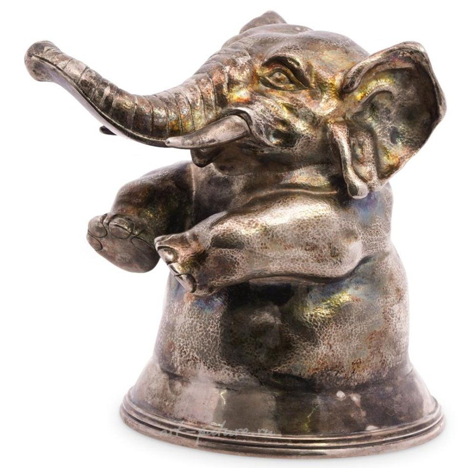 Русский серебряный кубок-стремя от производителя Samuel Arndt выполнен в виде слона с поднятым хоботом и дополнен золотой полировкой внутри, дополнительно на нем нанесен российский знак чистоты серебра 84 пробы и "S.A" для Samuel Arndt. Общий вес: 206 грамм ПРИМЕРНО: Начало-середина 20 века. ПРОИСХОЖДЕНИЕ: Россия РАЗМЕРЫ: В: 3 "Ш: 3" - СОСТОЯНИЕ: Отличное.