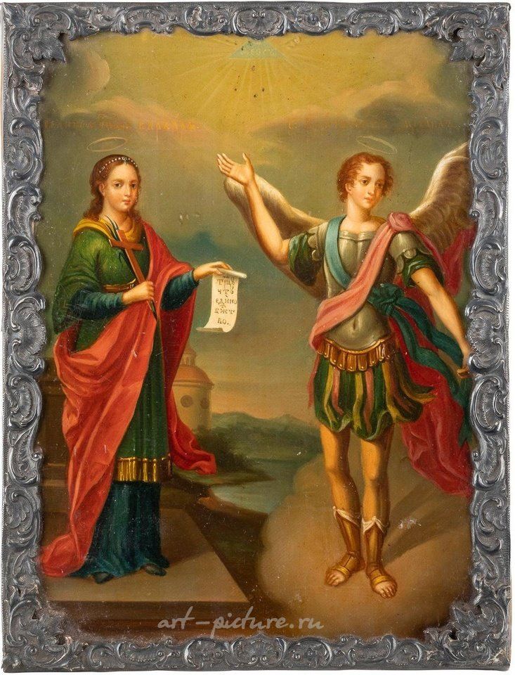 Икона, изображающая святую Варвару и архангела Михаила с серебряной басмой. Русская, середина XIX века (икона), русская, Санкт-Петербург, Адам Андреас Маркула, середина XIX века (басма). Масло на холсте, прикрепленном к деревянной панели с бархатной подкладкой. Границы украшены серебряной басмой с гравировкой. Отмечено городской клеймом, стандартом 84 и мастерским клеймом "А.М.". Незначительные потери. Размер 29,8 x...