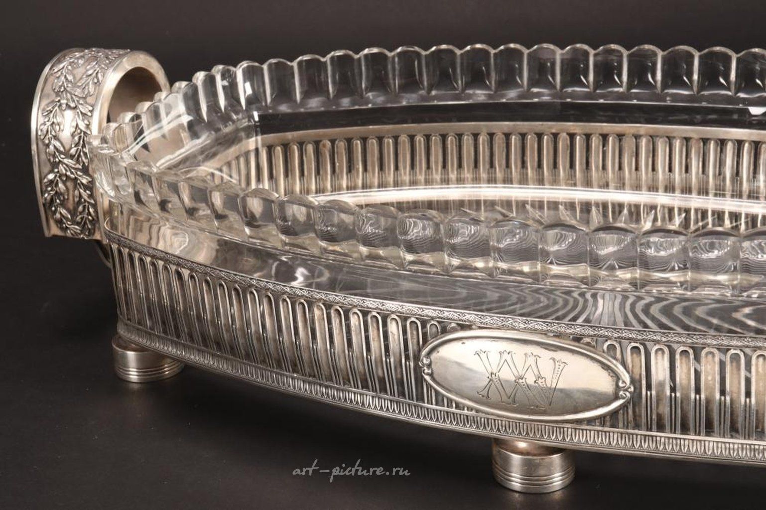 Изделие с маркировкой "Москва", со вспомогательной маркой "Кохник", изготовителя Егора Черятова и торговой маркой Федора Лори, оформленное глубокой хрустальной чашей в серебряной оправе, с двумя картушами с монограммами, окруженное перфорированными бортиками с тонкой каймой, обрамленное парой ручек-петель, украшенных рельефными мотивами листьев и ягод, поднят на шести цилиндрических ножках, 51,5 см х 26 см, общий вес серебра 1195 грамм. Примечание:
