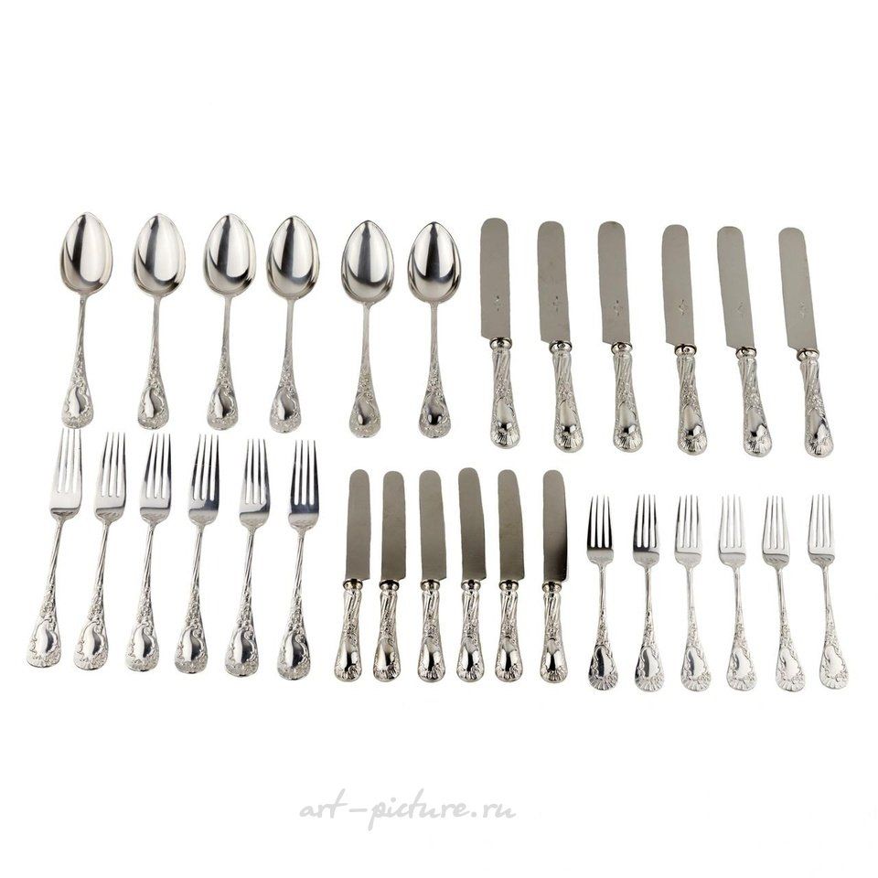 Хлебников. Набор столового серебра (30 предметов) на 6 человек. Серебро 84 пробы. Общий вес: 2423 г. Российская империя. 1908-1927 гг. Набор состоит из: 6 столовых ножей, длина 25,8 см, общий вес 600 г; 6 столовых вилок, длина 21,5 см, общий вес 420 г; 6 столовых ложек, длина 21,8 см, общий вес 450 г; 6 чайных ложек, длина 14,5 см, общий вес 300 г; 6 десертных ложек, длина 17,5 см, общий вес 300 г; и 6 десертных вилок, длина 18,5 см, общий вес 350 г. Набор выполнен в стиле российской империи и отличается высоким качеством и изысканным дизайном. Это ценная коллекционная позиция, которая будет прекрасным дополнением к любому сервизу.