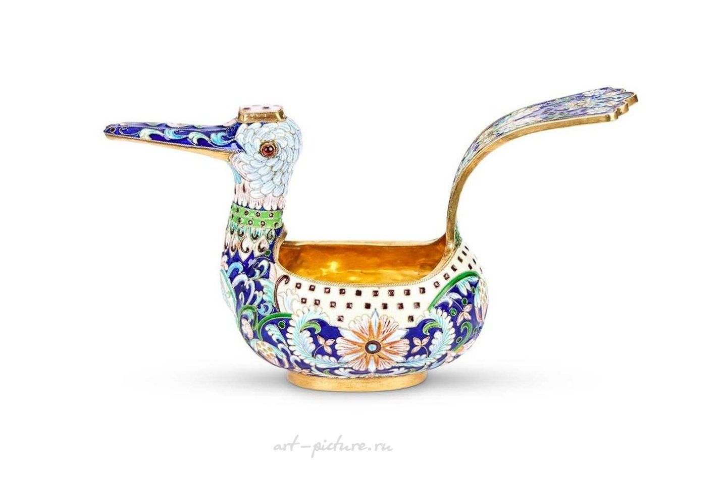 СЕРЕБРЯНАЯ С ПОЗОЛОТОЙ, ПЕРЕГОРОДЧАТОЙ ЭМАЛЬЮ И ДРАГОЦЕННЫМИ КАМНЯМИ БРАТИНА в РУССКОМ СТИЛЕ с глазами-кабошонами рубинового цвета, внутри с серебряной позолотой, нижняя сторона с псевдорусскими клеймами, вес около 200 граммов, длина 18,5 см х высота 10 см.
