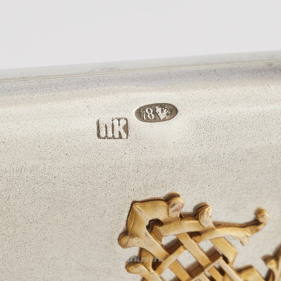 Пара русских серебряных сигаретных кейсов с нанесенными декоративными подписями. Один кейс с имперским орлом, вставленным кабошоном турмалина, и аналогичным кабошоном турмалина для кнопки закрытия. Кейс с турмалином маркирован "84" кокошником и мастерской в кириллице. Ребристый кейс маркирован кокошником и мастерской "КС", вероятно, Константин Скворцов (Москва, 1887-1908). Происхождение: Известная коллекция.