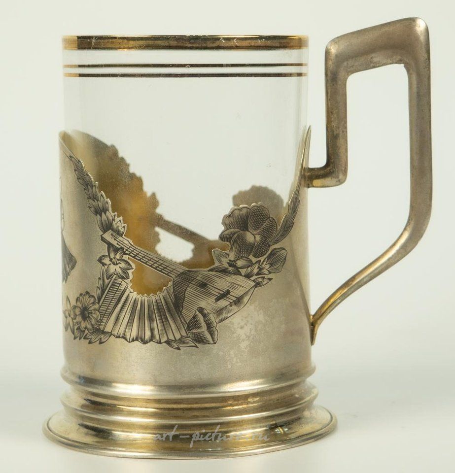 Подстаканник "Танец" из русского серебра с стеклом. Артель "Московский Ювелир", 1954 год. Русское серебро 875 пробы, черное. Вес 107 грамм, высота с ручкой 11 см.