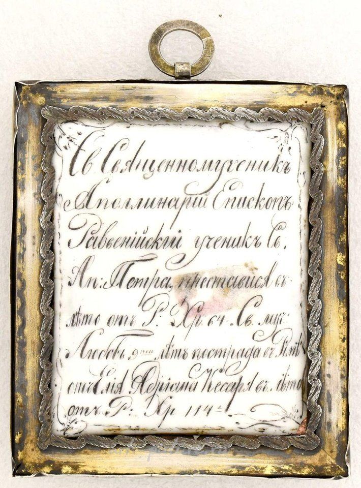 Русская финифтовая икона "Святой Аполлинарий Равеннский и Святая Любовь". - Россия, XIX век. - 9х8 см. Финифт. Серебряный оклад с клеймом 84. Кириллическая надпись на обратной стороне иконы. Состояние: по запросу.