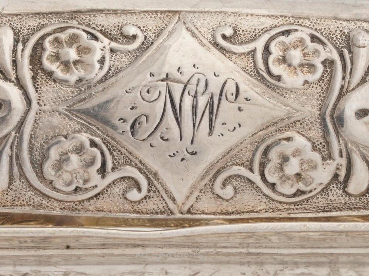 Императорская Русская серебряная конфетница, ножка с подвижной ручкой. Изделие имеет лопастную форму и украшено тисненым узором роз на краях. На передней стороне чаши выгравированы инициалы NW. Ручка поддерживается двумя птичьими фигурками с обеих сторон. Внутренняя сторона предмета позолочена. На дне имеются клейма с указанием стандарта серебра 84 и марки производителя. Вес: 304 грамма. Коллекционная русская серебряная посуда и сервировочные изделия.