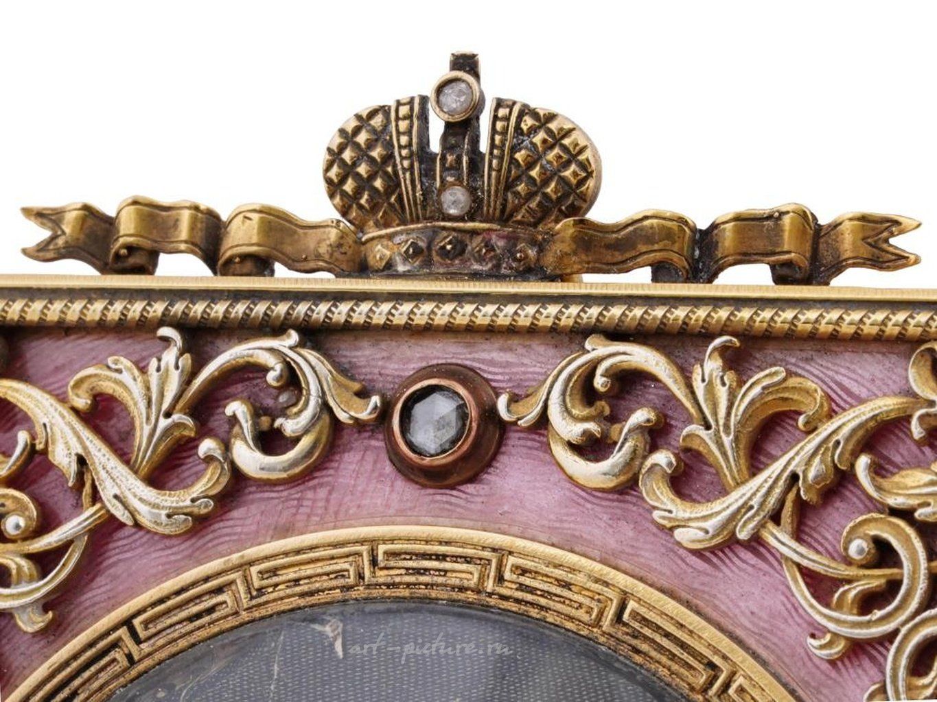 Русская серебряная подставка в золоченом исполнении. Прямоугольная форма с вертикальным овальным отверстием для изображения. Поверхность рамки покрыта розовым гильоше эмалевым покрытием с орнаментальным наложением, украшенным бриллиантами. Наверху рамки находится Императорская корона. Внутри рамки находится гравюра портрета русской императрицы Екатерины Великой. С обратной стороны рамки имеется клеймо с указанием стандарта серебра 84 и марки производителя. Общий вес рамки составляет 181 грамм.