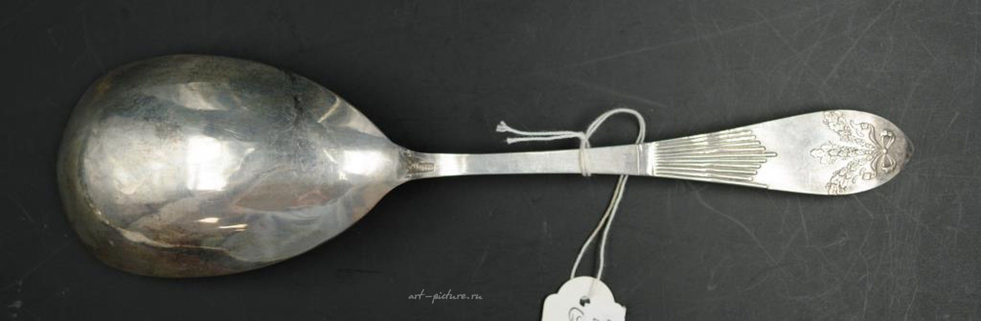 Две разных русских серебряных сервировочных ложек, включая: большую ложку для подачи с широкой чашей и тисненым украшением на рукоятке, отмеченную на нижней стороне чаши, (длина 24 см; вес около 82 грамма); и половник/чайный фильтр с проколотой чашей, отмеченный '84' на чаше, с монограммой, (длина 15 см; вес около 38 граммов); каждая из них относится к началу 1900-х годов.