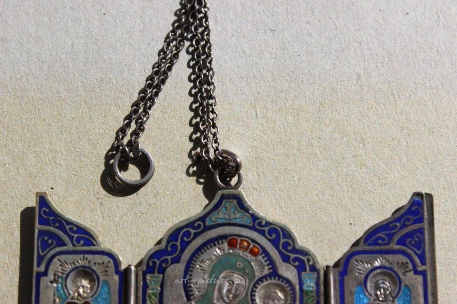 Иконостас Карла Фаберже с эмалированными серебряными панелями, изображающими Иверскую Божью Матерь, Императорская Россия. На четырех печатях: 1. Двуглавый орел (Российская империя), 2. Карл Фаберже, 3. 84 проба = процент серебра; 4. Святой Георгий Победоносец, что означает - сделано в Москве. Ширина в полностью открытом положении: 73 мм; Ширина в закрытом положении: 37 мм; Высота: [недостающая информация].