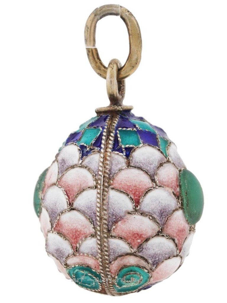 Русская подвеска в форме яйца из золоченого серебра с эмалевым покрытием. Шарм имеет поверхность клоизонне эмали, сочетающую в себе мотив чешуек рыбы и геометрические орнаменты. Овальные зеленые кабошоны из драгоценных камней украшают изделие с обеих сторон. Подвесное кольцо имеет клеймо 88 серебряного стандарта и марку производителя. Вес: 7 грамм. Русская ювелирная продукция, серебряные изделия и коллекционные предметы.
