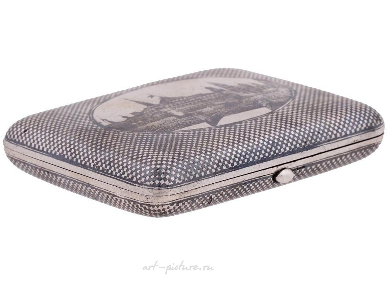 Русский сигаретный кейс, украшенный шахматным ниелло-орнаментом на всей поверхности и архитектурным видом Московского Кремля в овальной медальоне на крышке. Внутренняя часть покрыта золотистым покрытием. Замок с кнопкой. Помечен маркой 84 русского серебра, Георгием Победоносцем для Москвы и другими марками и пробирными клеймами. Русская серебряная посуда, аксессуары для табачных изделий и антиквариат. Вес: 125 грамм.