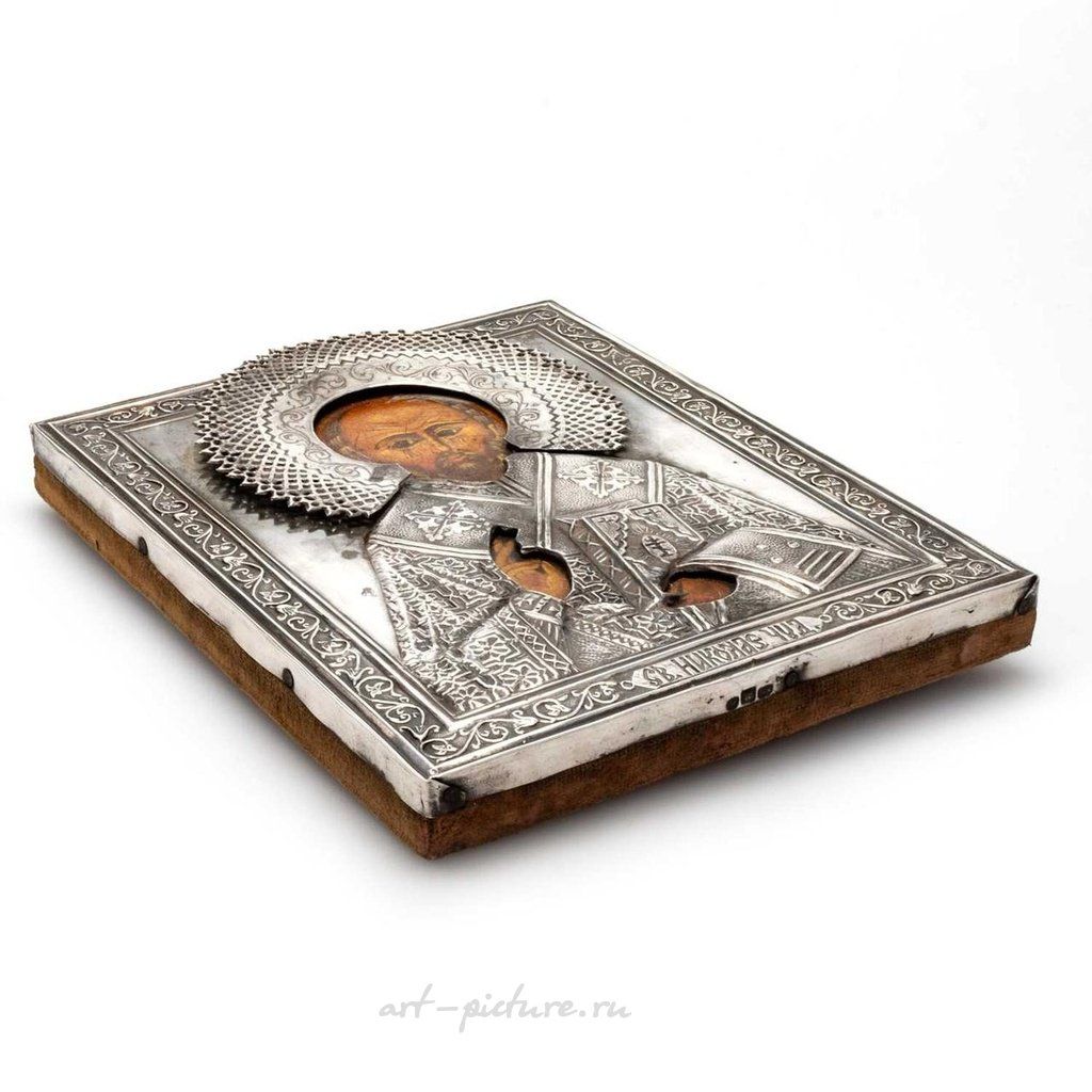 Поздний 19-й век СЕРЕБРЯНАЯ ИКОНА с монтажем от Александра Тимофеевича Шевякова, 1890 год, Санкт-Петербург, стандарт 84, прямоугольная рама с открытым узором, вставленная с лицом и руками, выпуклыми одеждами и книгой, внутри листового бордюра, с кириллическим текстом. 22см на 17,5см, в целом хорошее состояние, трещины в краске, износ и повреждения, соответствующие возрасту.