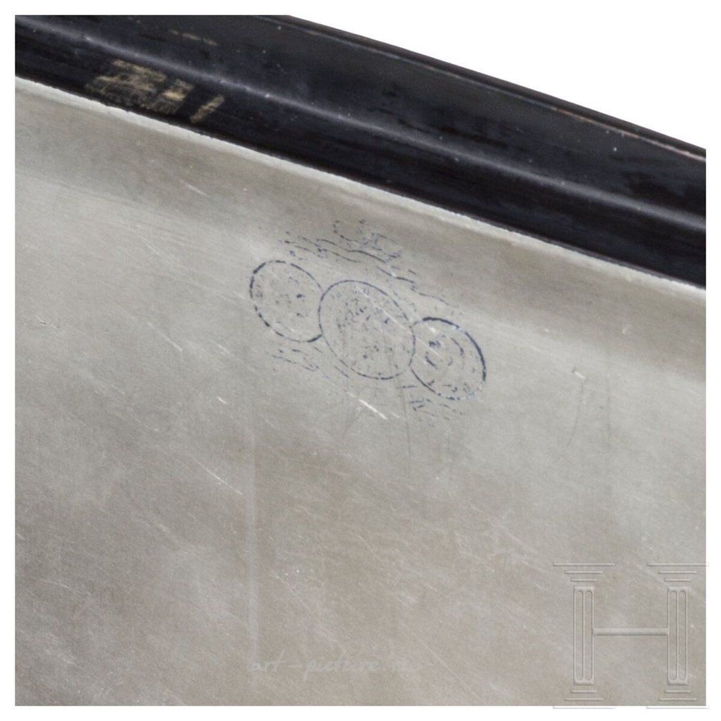 Папье-маше, черная лакировка, внутри обита серебряной фольгой. Шарнирная крышка с полихромной темперной живописью: вид медного всадника на Сенатской площади в Санкт-Петербурге (конная статуя царя Петра Великого). Внутри крышки размещены выставочные медали. Есть незначительные пропущенные части. Размеры 9,5 x 17,5 x 11,5 см. См. книгу "Русские лаковые папье-маше коробки: 200 лет ручной миниатюрной живописи".