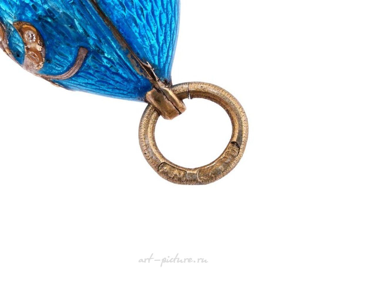 Русская серебряная подвеска в форме пасхального яйца. Подвеска покрыта голубой гильошированной эмалью и украшена выпуклым изображением ягоды с веткой, украшенной семью бриллиантами. На кольце подвески имеются маркировки: 88 русский серебряный стандарт, марка "кокошник" и инициалы производителя. Ручная работа, изысканное ювелирное изделие, русская ювелирная продукция для коллекционеров, подарков и аксессуаров для женщин. Общий вес: 5 грамм.