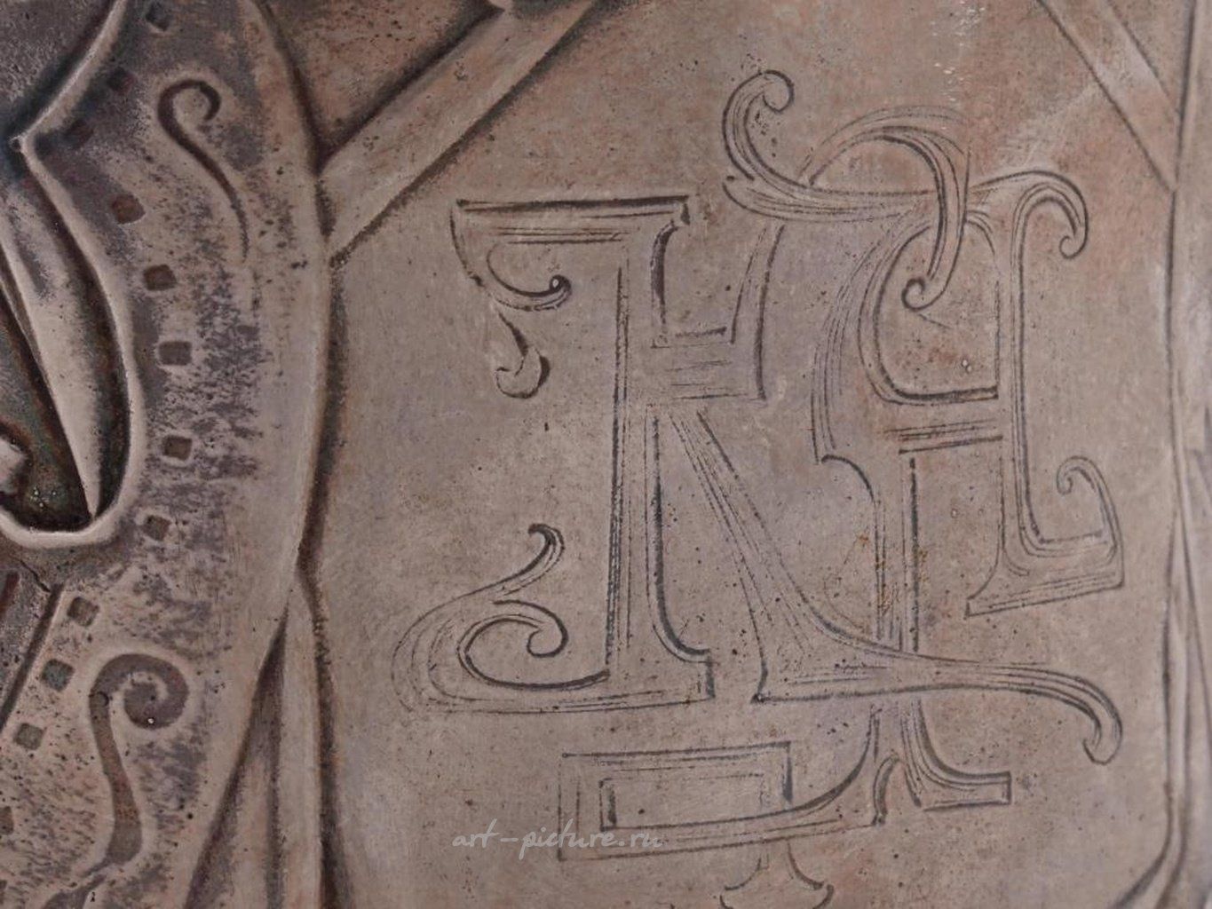Подстаканники украшены выпуклыми изображениями богатырей и гравированными стилизованными инициалами КН. Маркировка серебра стандарта 84 и марка изготовителя находятся на боковой стороне обоих подстаканников. Общий вес: 289 грамм. Подстаканник - это русский держатель для стакана, обычно используемый для горячего чая. Коллекционная русская серебряная посуда и столовые приборы.