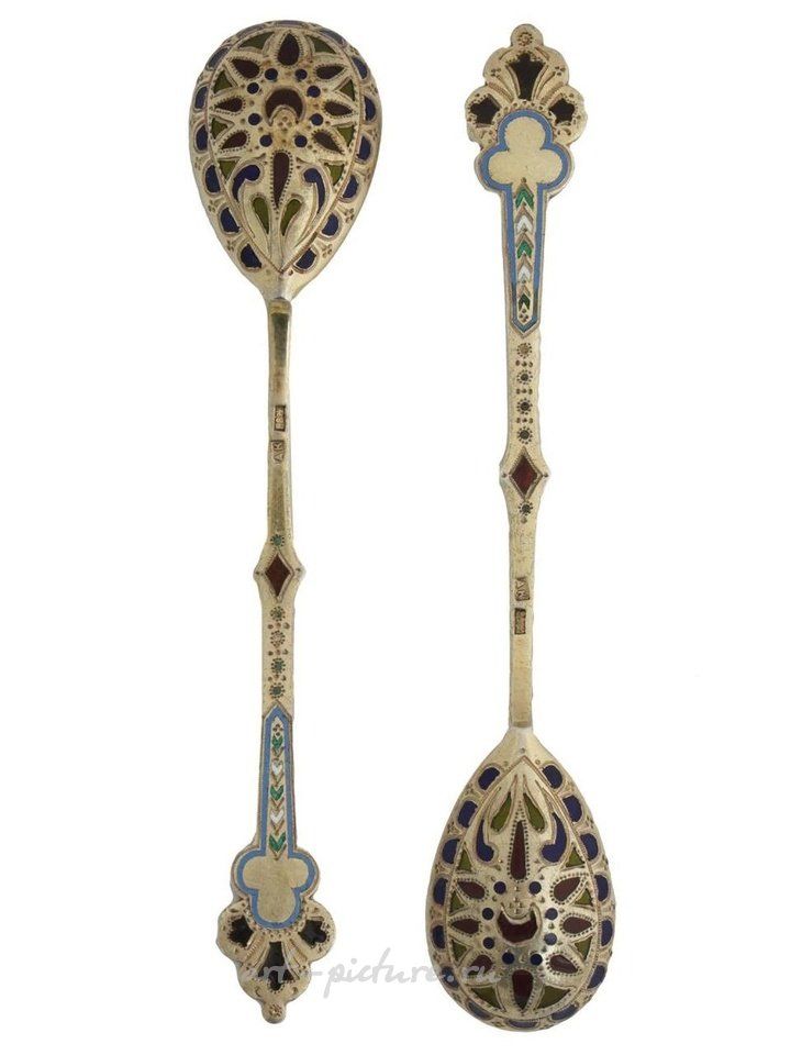 Пара русских серебряных ложек с позолотой и эмалью от фабрики А.И. Кузьмичева. Чашки ложек украшены полихромным растительным орнаментом и геометрическими узорами, выполненными в технике плике-а-жур. Стебли ложек украшены орнаментом в виде торсионной веревки и также покрыты эмалью в той же технике. Отмечены стандартной серебряной маркой и другими кириллическими и пробирными марками. Общий вес 20 грамм. Русская серебряная посуда и коллекционирование.