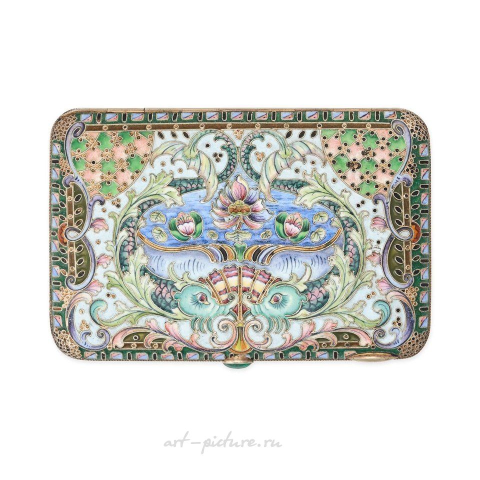 БЕЗ РЕЗЕРВА - ВЫСОКОКАЧЕСТВЕННЫЙ АНТИКВАРНЫЙ СЕРЕБРЯНЫЙ КИСЕТ ДЛЯ СИГАРЕТ В ИМПЕРАТОРСКОМ РУССКОМ СТИЛЕ, ИЗГОТОВЛЕННЫЙ 20-М АРТЕЛЕМ В МОСКВЕ В 1908-1917 ГОДАХ. КИСЕТ ИМЕЕТ ПРЯМОУГОЛЬНУЮ ФОРМУ С ПРИСТЕГИВАЮЩИМИСЯ КРЫШКАМИ И УКРАШЕНА РАЗНОЦВЕТНОЙ ЭМАЛЬЮ В ТЕХНИКЕ КЛОИЗОННЕ. НА ОБОИХ СТОРОНАХ КИСЕТА ИЗОБРАЖЕНЫ ПАРЫ ДЕЛЬФИНОВ, ОБЪЕДИНЯЮЩИХ ПРУДОВЫЕ СЦЕНЫ, А ТАКЖЕ УКРАШЕНЫ ЦВЕТАМИ, СКРОЛЛАМИ И ГЕОМЕТРИЧЕСКИМИ УЗОРАМИ, ВЫПОЛНЕННЫМИ В ЭМАЛЕ. НАЛИЧИЕ КИРИЛЛИЧЕСКОГО МАРКЕРА И ВТОРОГО КОКОШНИКОВСКОГО ПРОБИРНОГО ЗНАКА.