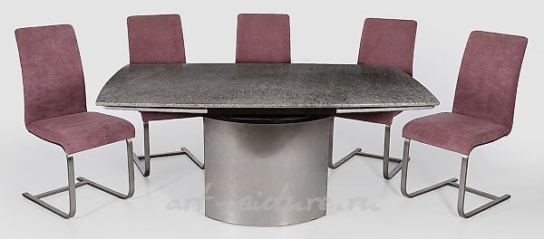 6把椅子和一张伸缩桌。金属和黑白花纹的花岗岩。通过中央底座,矩形、圆形和两侧可伸缩的桌面;悬挂式椅子,高靠背,经过填充和覆盖。桌子高74.5厘米,104.5厘米x 164/260厘米。座位高47厘米。一套五把意大利椅子和一张带花岗岩台面的伸缩桌。意大利,1990年代。