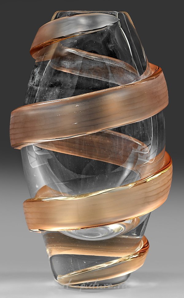 这是一件由卡洛·斯卡尔帕设计的切割“Battuto”玻璃花瓶,由Venini制造。刻有工厂标记“Venini (19) 87”和透明塑料工厂标签“VENINI MURANO MADE IN ITALY”。意大利,穆拉诺,Venini,1987年。这个身体由无色,厚壁玻璃制成,作为装饰有一个螺旋形的高度拉伸的蛇状支撑,由杏色玻璃制成,带有覆盖整个表面的哑光“Battuto”切割。高32厘米。