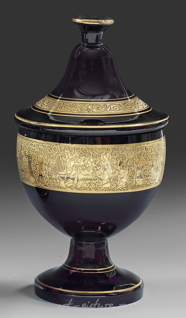 在一个钟形底座、卵形身体、钟形盖子和把手的柄上。深紫色玻璃,部分磨砂,酸蚀和镀金的金属装饰,由两个环绕的花饰图案组成,有音乐家女士或者蒲公英的图案。高31.2厘米。一个波希米亚切割紫罗兰色玻璃糖果盒和盖子,由约翰·厄特尔在海达(诺维伯尔)制作。波希米亚。海达(诺维伯尔)。约翰·厄特尔和合作伙伴;约1925年。