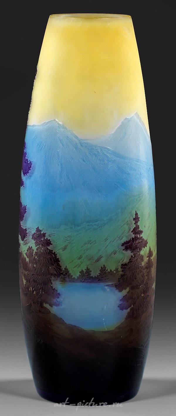 修长,轻盈的凸面滚筒形状。采用过渡玻璃,无色,琥珀黄,浅蓝,紫色和棕色。在多个工序中雕刻和抛光的装饰,以黄昏色调的风景为主题,展示了一片被树木环绕的湖泊和高山峰。签名:加勒。高33.5厘米。参见邓肯/德巴塔,《加勒的玻璃》,伦敦1984年,第192页,图289;希尔申茨-姆利内克/里克,《亨特里希收藏目录》,编号349-50(装饰变体)。一只法国浮雕玻璃花瓶,由加勒装饰,描绘了阿尔卑斯山脉的风景。签名:法国南锡,埃米尔·加勒。约1906-1914年。