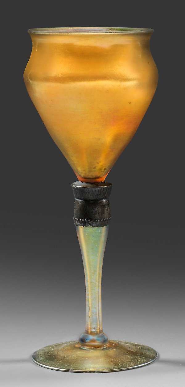 轻微上升的盘状底部,中空的棍状柄,盘状底部上方轻微向上延伸成骨状模型的吹制,呈郁金香花瓣状或钟状的杯子。金黄色,呈虹彩的蒂凡尼-法夫里尔玻璃。柄经过旧修复,带有金属装饰。签名为"L.C.T.法夫里尔1267"。高23.8厘米。美国长岛/纽约。路易斯·康福特·蒂凡尼工作室的金色法夫里尔玻璃酒杯。旧修复带有金属装饰。签名为"L.C.T.法夫里尔1267"。约1900-1910年。