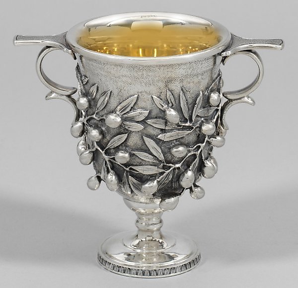 斯特林银。展示的,有轮廓的圆足,边缘被月桂叶花饰围绕,过渡到短的栏杆柄,带有高,向外摆动的圆锥形杯口。浮雕墙面环绕装饰着浮雕式塑形的橄榄枝,带有长矛形状的叶子,并且悬挂着丰盛的橄榄。两侧下唇边缘下方有两个弯曲的窄手柄,呈耳形弯曲。底部刻有姓名和日期,以及标志“AF78”(?)。内部镀金。925标志,鉴定标志,制造商标志和编号“825”。重约1430克。高16.3厘米。这是一只沉重而装饰性的意大利斯特林银高脚杯。刻有名字和日期。内部镀金。标准标记925,鉴定标记,制造商标记和编号。签名为“AF78”(?)。意大利,米兰。Giacomo Vavassori。20世纪下半叶。