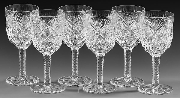 无色的水晶玻璃,精细磨光。轻微上升的盘状底座,带有底星,六个面剥离的柄,带有刻痕的角,高杯口带有精美的装饰性切割。高度14.7厘米。一套六个法国圣路易斯“佛罗伦萨”雪利酒杯。法国,圣路易斯莱比什。圣路易斯水晶器厂。约2000年制作。