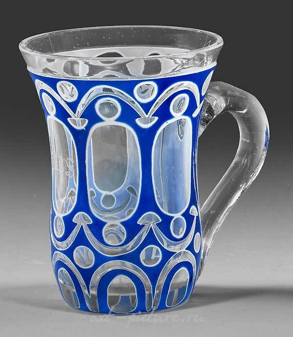 无色玻璃,白色锡釉和蓝色釉面。精美的切割装饰。正面刻有剪裁的单字母。高11.5厘米。来源:根据前任所有者的信息,来自汉诺威的Uwe Friedleben收藏;Inge Brück收藏。波希米亚切割玻璃杯,带有手柄和刻有单字母的图案。波希米亚,19世纪中叶。