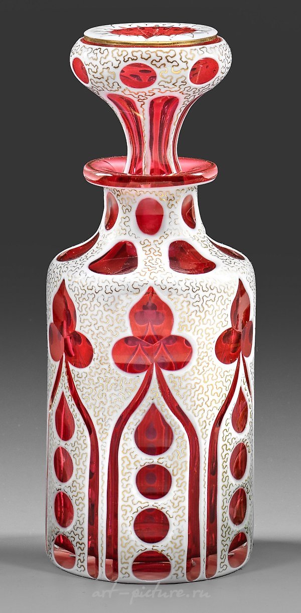 色彩斑斓的玻璃,明亮的红宝石色或者覆盖着白锡釉的覆盖物。表面装饰覆盖整个区域,经过抛光并用金色细线装饰。高17.5厘米。来源:根据前任所有者的信息,来自汉诺威的Uwe Friedleben收藏;Inge Brück收藏。波希米亚或者西里西亚的玻璃瓶和瓶塞,带有切割和金色装饰。可能来自施莱伯豪的约瑟芬瓦特。19世纪中期。