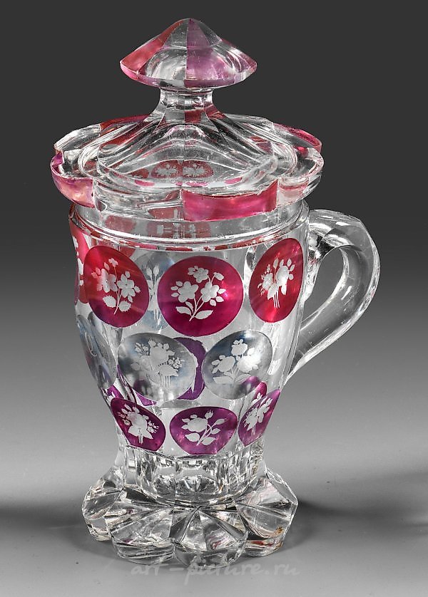 这是一只由厚壁、沉重的水晶玻璃制成的手柄杯,经过切割和雕刻。杯子上部和接触杯子的部分有八个凸起的脚,壁上有17个浅蓝色和紫红色的着色球以及深度切割的玫瑰花枝。中间有一个高振动的八角形盖子,盖子上有对应的八角形刻花钮。德国制造,高度18厘米。来源:根据前任所有者的信息,来自汉诺威的Uwe Friedleben收藏,Inge Brück收藏。这是一件波希米亚风格的手柄玻璃杯和盖子,切割和雕刻装饰。有轻微磕碰。可能来自布洛滕多夫(Blottendorf)的弗里德里希·埃格曼(Friedrich Egermann)工作室,约1840-1850年。