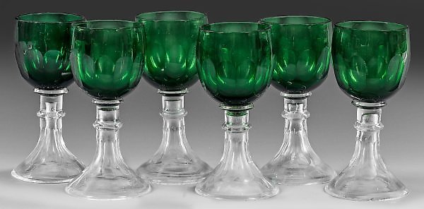 钟形脚和中空的柄,由无色玻璃制成,卵形的杯子由绿色玻璃制成,都有环绕的刻面。脚部有轻微磕碰;高约13.5厘米。一套六个德国切割罗马玻璃杯。脚部有轻微磕碰。德国,19世纪下半叶。