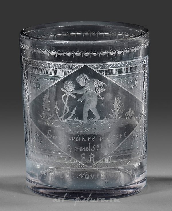 轻巧的锰灰色玻璃,带有抛光的切口。圆柱形。正面展示一个矩形区域,有抛光的几何装饰和菱形区域,以及一个切割的爱神图案,连接到一个草岛上的锚上,下面有铭文“我们的友谊永恒,他于1817年11月29日”。高9.5厘米。一件波希米亚雕刻水晶玻璃友谊杯,日期为1817年。波希米亚,1817年。