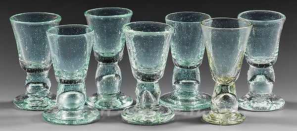 如此,守卫或马车夫。带有插入的大气泡的磨损的杆,锥形杯。一个玻璃破损。七个北德国酒或烈酒杯。北德/索林。19/20世纪。