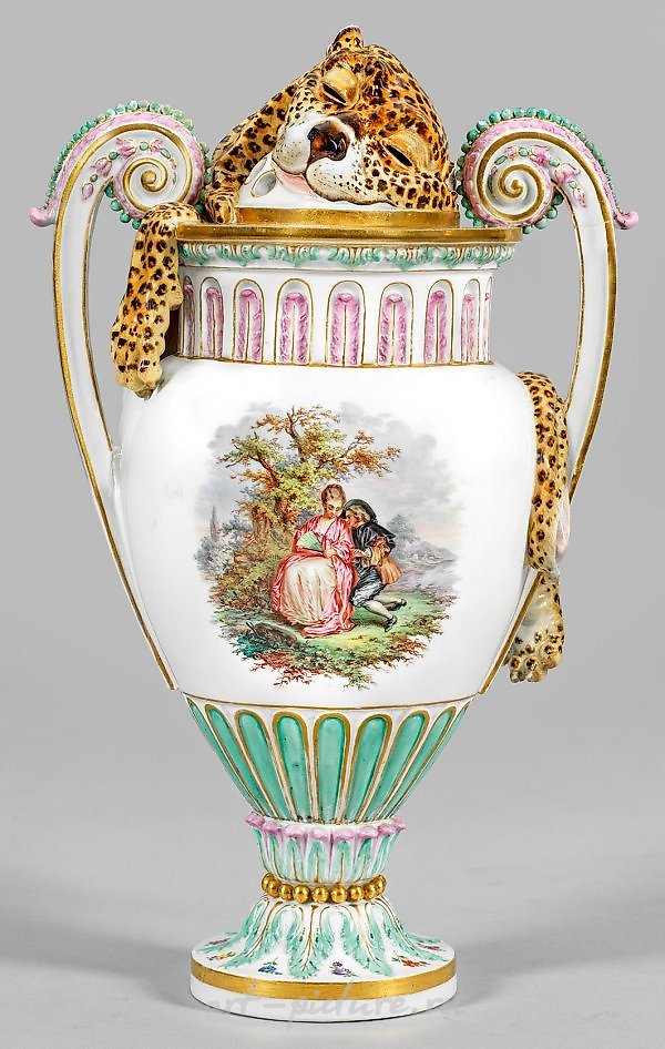 关于一个绘有多部分的圆底,带有金杖珍珠浮雕的花瓶形状的器身,带有圆肩,短颈和优雅边缘。插入,拱形和穿孔的盖子,上面有一个大型豹头,背面有一个塑料披着的豹皮,悬挂的爪子。侧面带状凸起的卷旋手柄。周围的浮雕装饰以海绿色和粉红色的装饰为主,包括卷叶、长矛和舌叶边框以及半通道。在可见的侧墙上,有一个岛屿风格的豪华华特奥场景,脚上散布着花朵装饰。精美的多彩绘画带有金色附件。可能是米歇尔·维克多·阿西尔。模型编号 G. 48. 最小值;有修复;剑形标记。高35厘米。这是一件18世纪的新古典主义风格的令人印象深刻的花瓶,具有创意设计的塑料装饰。带有豹纹盖子和华特奥场景的新古典主义瓷质香炉。有轻微磕碰。经过修复。过路剑标记。美因斯。19世纪下半叶。