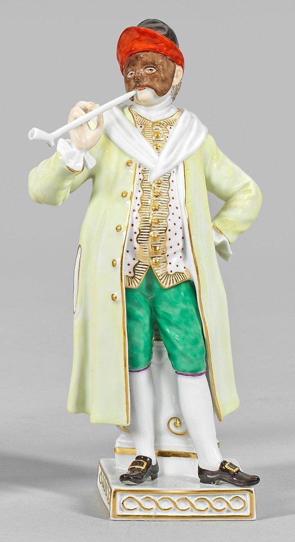 一个四方坛基上站着一位穿着精致、部分镶金饰、戴帽子和棕色面具的站立喜剧演员。他右手拿着烟斗。彩色绘画,配以金装饰。可能是由约翰·约阿希姆·肯德勒制作。型号64559。剑标记。高度18厘米。一尊意大利喜剧剧团《Commedia dell'arte》中的“Cortesano”瓷人像。美因茨。2000年后。