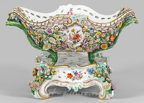 拱形的,下垂的卷河岩螺旋底座上装饰有花卉。弯曲的,深凹的水果篮形状的手柄过渡到脚部。像篮子一样的穿孔墙壁上有塑料贴花藤蔓,两侧有卷河岩形状的保留部分,包含有色彩丰富的花朵布置和在镜子中的大束花。彩绘与金色装饰。状况:部分修复;剑刻痕迹。篮子高度:19.5厘米,尺寸:51厘米x 38厘米。底座高度:13厘米,尺寸:32厘米x 32厘米。一片大型瓷制水果篮中心装饰有绘画和贴花花朵的底座。有损坏。部分修复。陶瓷标记。美茵。19世纪末。