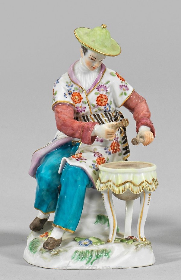 一块岩石上坐着一个穿着装饰有美洲原住民花朵的日本男人,他旁边敲击着一张桌上的小手鼓。彩绘带金装饰。可能由弗里德里希·埃利亚斯·迈耶创作。型号E44。经过微小修复;剑交叉标记。高度13厘米。一件带有小手鼓的日本瓷人偶。微小修复。剑交叉标记。美泽。二十世纪中叶。