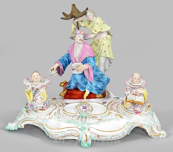 四件套;三段落上有中央人物组坐在红色垫子上,由一个拿着开着的壶的中国男子组成。在他的背后站着一个拿着黄铜制成的防护棕榈叶的仆人。他们的旁边是一个穿着花衣的中国男孩或女孩,作为墨水或洒水容器。花草纹和零散花朵装饰,采用彩色画和金色杂饰的浮雕rocaille。可能是弗里德里希·埃利亚斯·梅耶制作的。型号2778。部分描述/损坏/修复;剑形标记。平板尺寸为35厘米x 25厘米。人物高度为8.5厘米至21厘米。请参见Rückert,《美泉目录》,拜恩国立博物馆,编号993。一个带有人物的四件套写字台。部分损坏/破损/经过微不足道的修复。剑形标记。美泉。约1860年至1880年。