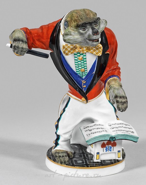 来自猴子管弦乐团。一只站立在圆形基座上的猴子,身穿红色燕尾服,手持乐谱和指挥棒。彩绘加金。可能是奥托·皮尔兹绘制于1912年左右。可能有标记,型号为C 271。剑痕。高度19.5厘米。这是一系列猴子人物之一,奥托·皮尔兹(1876-1934)通过幽默讽刺人类的行为和弱点,像18世纪的约翰·约阿希姆·坎德勒一样。皮尔兹主要以其自然主义、动态移动的动物形象闻名,从1905年起成为美茵制瓷厂的自由雕塑师。它们属于青年风艺术瓷雕的杰作。这些独特而幽默的猴子管弦乐团的人物在风格上明显偏离了自然主义,展示了这位艺术家的多才多艺。请参阅Jedding 的《19世纪和20世纪美茵瓷器》,第116页及以下;Sonntag 的《经验艺术》,第98页。一件由奥.皮尔兹塑造的猴子管弦乐团指挥员瓷质人物。剑交叉标志。美茵。大约于1912-1923年间。