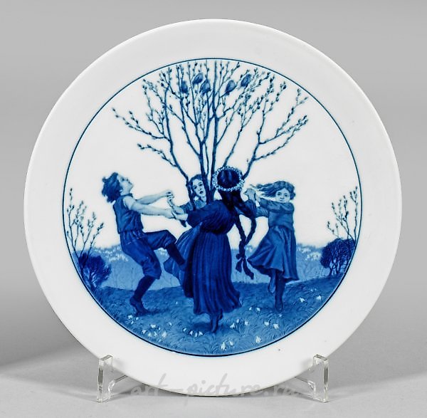 圆形。在平坦的凹面镜中,有轮廓分明的奖章框架,内有三个女孩和一个男孩在春季般的风景中跳舞,围绕着一棵树形成一个圆圈。多彩的釉下蓝色绘画。装饰-可能是由鲁道夫·亨舍尔设计和执行的,约于1915年。挂墙用的。无关紧要的磨损;叉状剑标记。直径25厘米。一件20世纪早期的瓷盘,用釉下蓝色绘制了一个儿童跳圆舞的人物场景。磨损轻微。叉状剑标记。美因茨(德国瓷器产地)。20世纪早期。