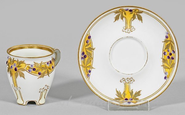 在下部分。在一个四倍放置的架子上,有一个钟形的身体和一个弯曲的手柄。在墙上和镜子里,有轴对称的装饰。精致的浆果树枝和勿忘我花由淡紫色和淡蓝色琉璃珠制成,以及太阳黄的背景区域。采用彩色釉上和珐琅彩绘加以装饰,金色饰物。装饰可能是由Richard Fuhry在约1902年制作的。有轻微摩擦;权杖和画家的标志。高度5.5厘米。请参阅Bröhan博物馆目录,第一卷,编号108;I. v. Treskow,《少国派瓷器》 ,编号53,63,第295页,编号6976。一件精美的新艺术运动风格瓷质摩卡杯,花朵采用珐琅彩绘装饰。有轻微摩擦。杖和画家的标志。KPM-Berlin。约1900年制作。